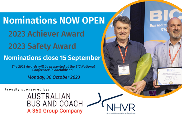 There are no non-voting positions on the Council. Nominations for Councillors will open on 18 September and close 24 September. Nomination forms will be sent to BIC members principle contact or by contacting the Secretariat. All nominations must have a seconder from within the relevant membership group. If more nominations are received than positions a ballot will be held. Interested in becoming a Councilor? Please reach out to the Secretariat or a current Councillor to discuss. National Awards Nominations for the 2023 National Achievers Award and the National Safety Award close on 15 September. The National Achiever Award is open to BIC and APTIA operator members as well as operator members of state bus associations. The National Safety Award is open to both operators and suppliers. The awards will be presented at the National Conference being held in Adelaide from 29 October to 1 November. Thanks to the award sponsors Sura Australian Bus and Coach and the National Heavy Vehicle Regulator.